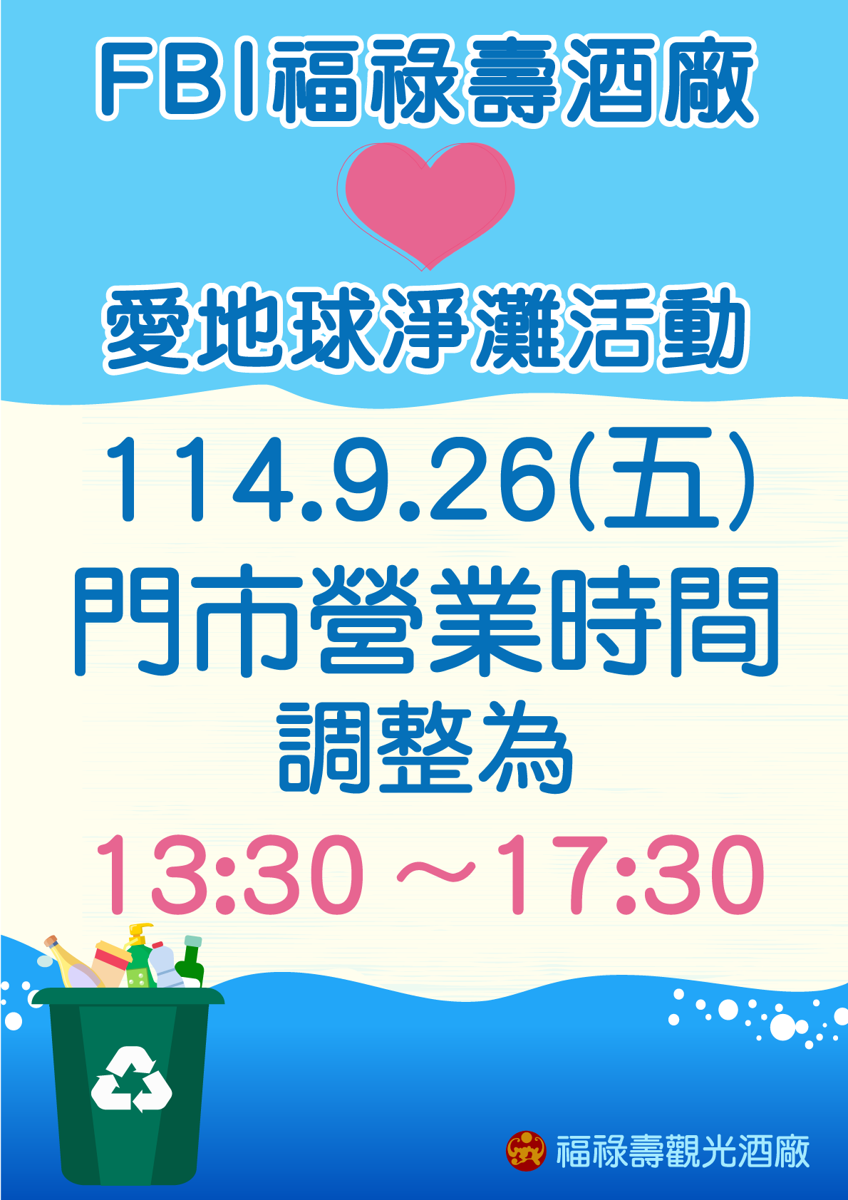 #淨灘活動來囉✨ 『FBI福祿壽酒廠❤️愛地球淨灘活動』 因酒廠一年一度的淨灘活動,共同愛護海洋🏖 故門市展售中心營業時間調整為 時間:114/09/26(五)13:30~17:30 感謝各位顧客配合~ #酒後不開車安全有保障 #未滿18歲禁止飲酒